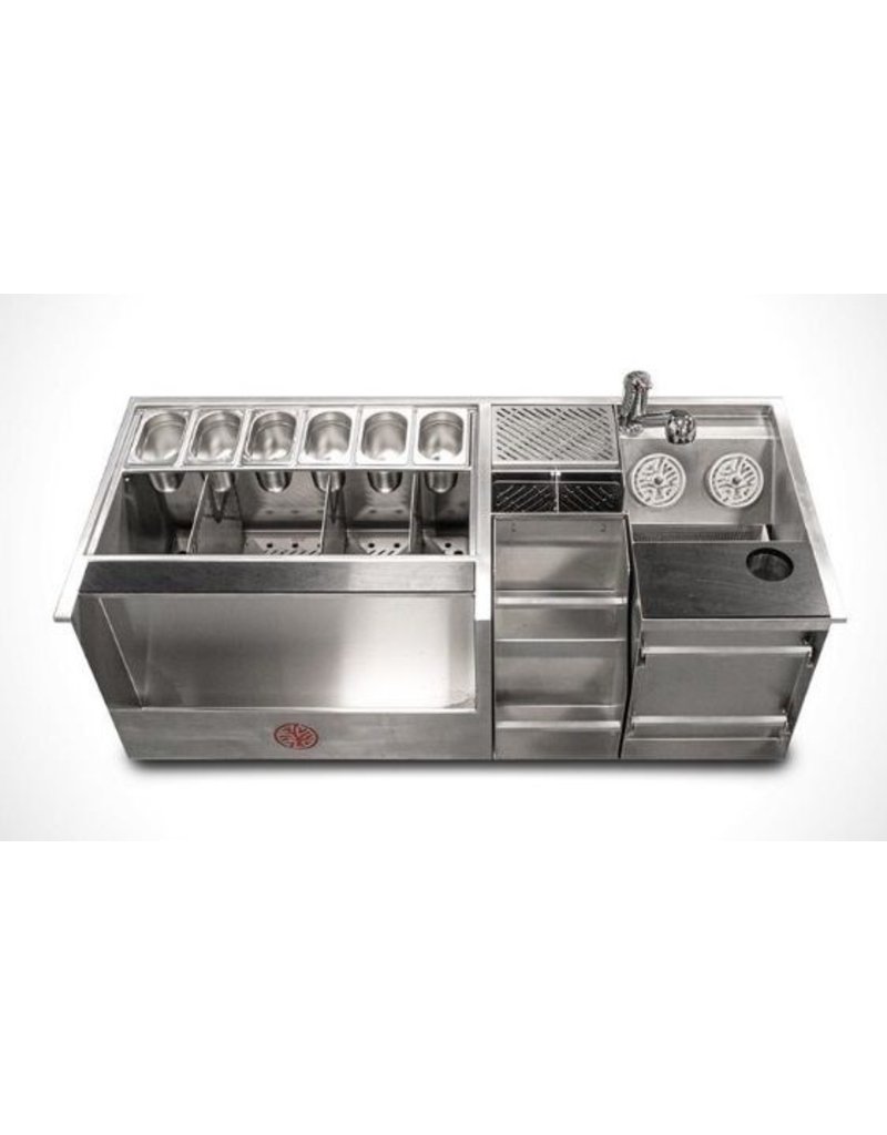 Quầy cocktail được xây dựng bằng thép không gỉ. Được lắp ráp như một gói hoàn chỉnh, thiết bị này bao gồm một thùng đá lớn với vỏ thép không gỉ, một bồn rửa, ngăn chứa 7-8 chai phía trước có ray tốc độ, ủng đóng chai để làm lạnh hỗn hợp, một cái thớt khoét lỗ rác, kệ để máy xay dinh tố 2 tầng, một dãy giữ khăn và một vòi nước lạnh.